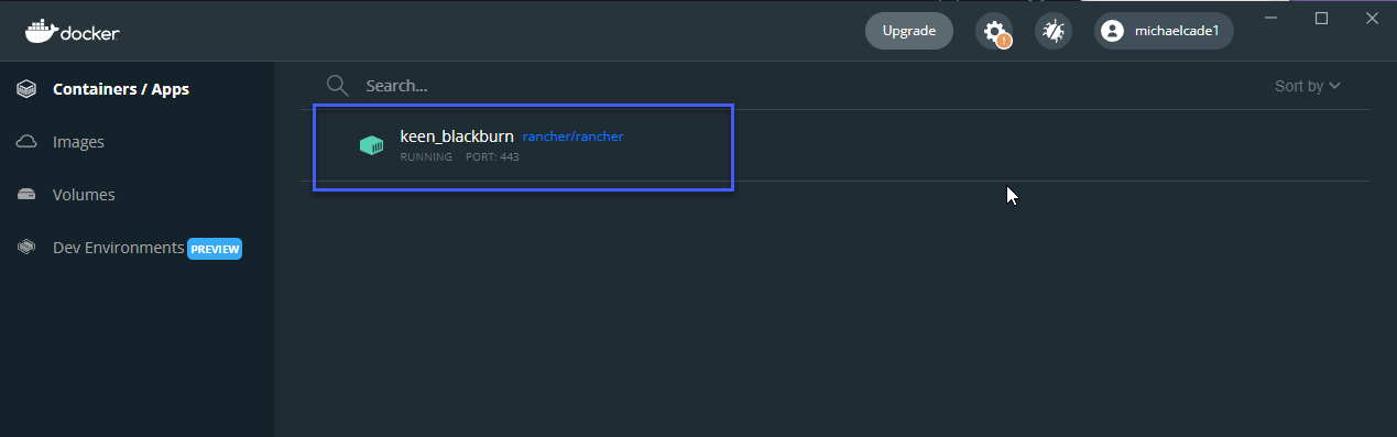 Như bạn có thể thấy trong Docker Desktop của chúng ta, có một Rancher container đang chạy.