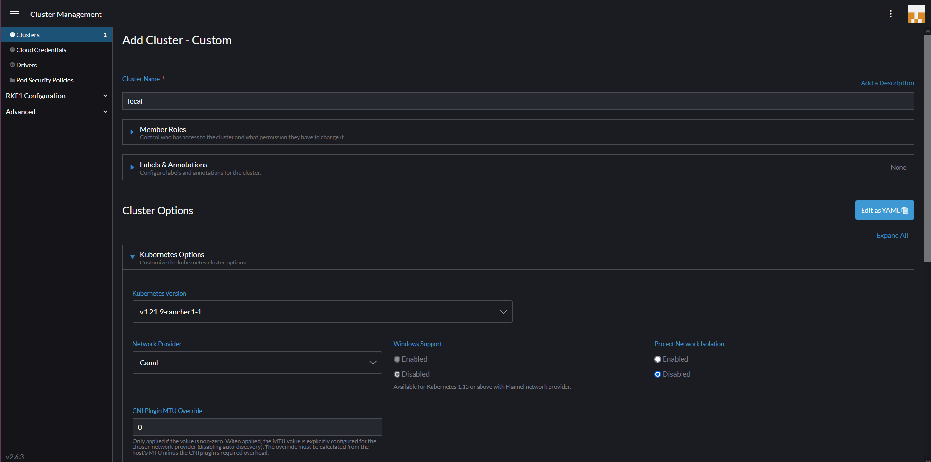 Chúng tôi sẽ chọn "custom" vì chúng ta không sử dụng một trong các nền tảng được tích hợp. Trang mở đầu là nơi bạn xác định tên cluster của mình (có ghi local ở dưới nhưng bạn không thể sử dụng local, cluster của chúng ta là vagrant). Bạn có thể xác định các phiên bản Kubernetes tại đây, nhà cung cấp mạng và một số tuỳ chọn cấu hình khác để khởi động và chạy cụm Kubernetes của bạn.