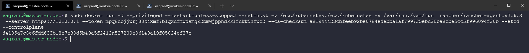 sudo docker run -d --privileged --restart=unless-stopped --net=host -v /etc/kubernetes:/etc/kubernetes -v /var/run:/var/run rancher/rancher-agent:v2.6.3 --server https://10.0.0.1 --token mpq8cbjjwrj88z4xmf7blqxcfmwdsmq92bmwjpphdkklfckk5hfwc2 --ca-checksum a81944423cbfeeb92be0784edebba1af799735ebc30ba8cbe5cc5f996094f30b --etcd --controlplane
