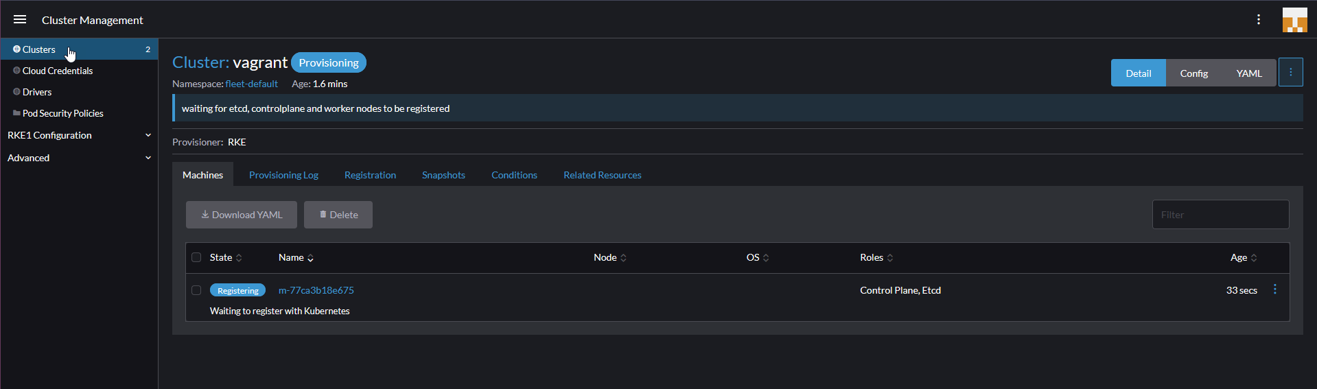 Nếu mạng được định cấu hình chính xác thì bạn sẽ nhanh chóng thấy thông tin sau trong bảng điều khiển rancher của mình, cho biết rằng master node đầu tiên hiện đang được đăng ký và cluster đang được tạo.