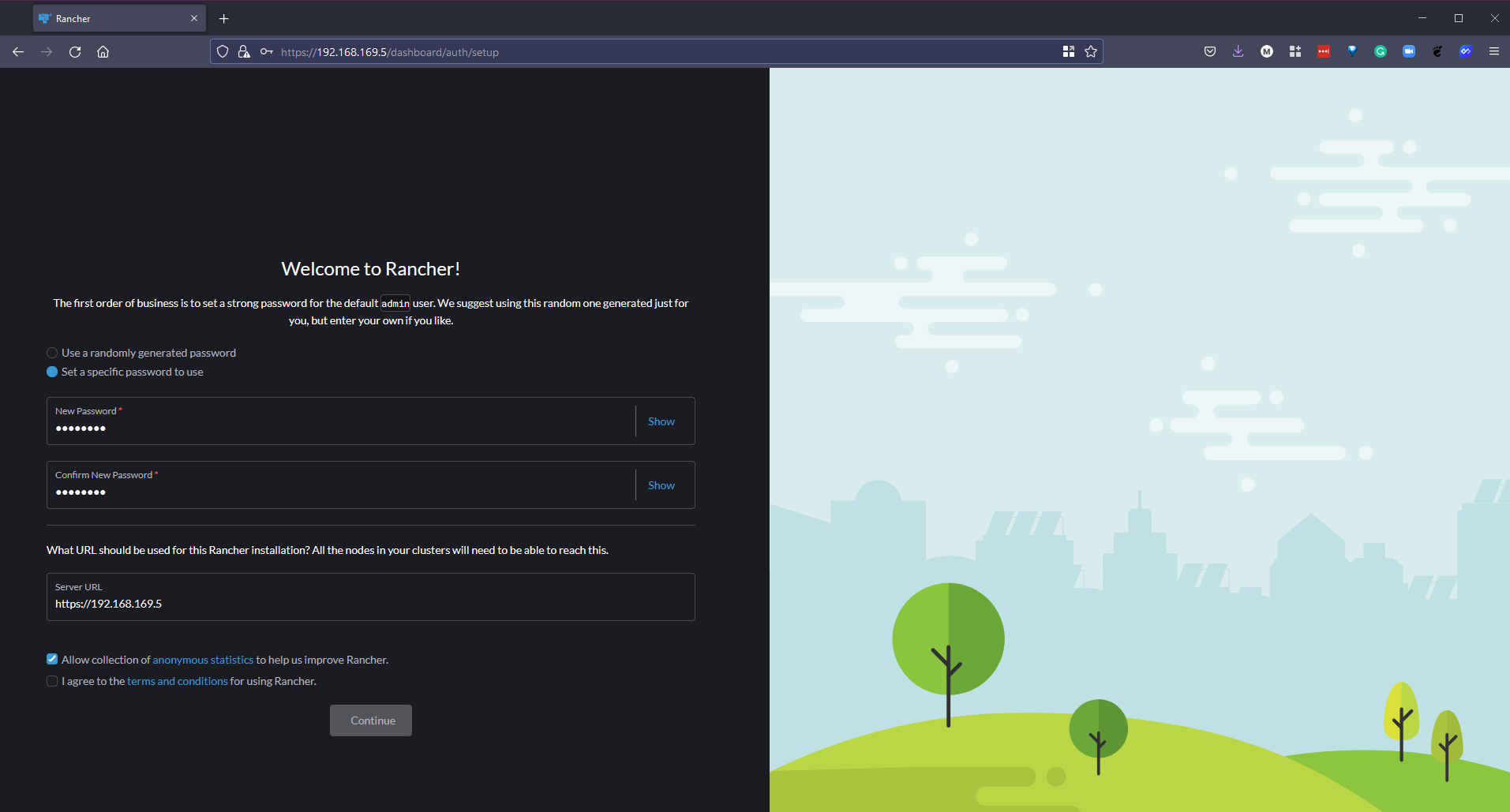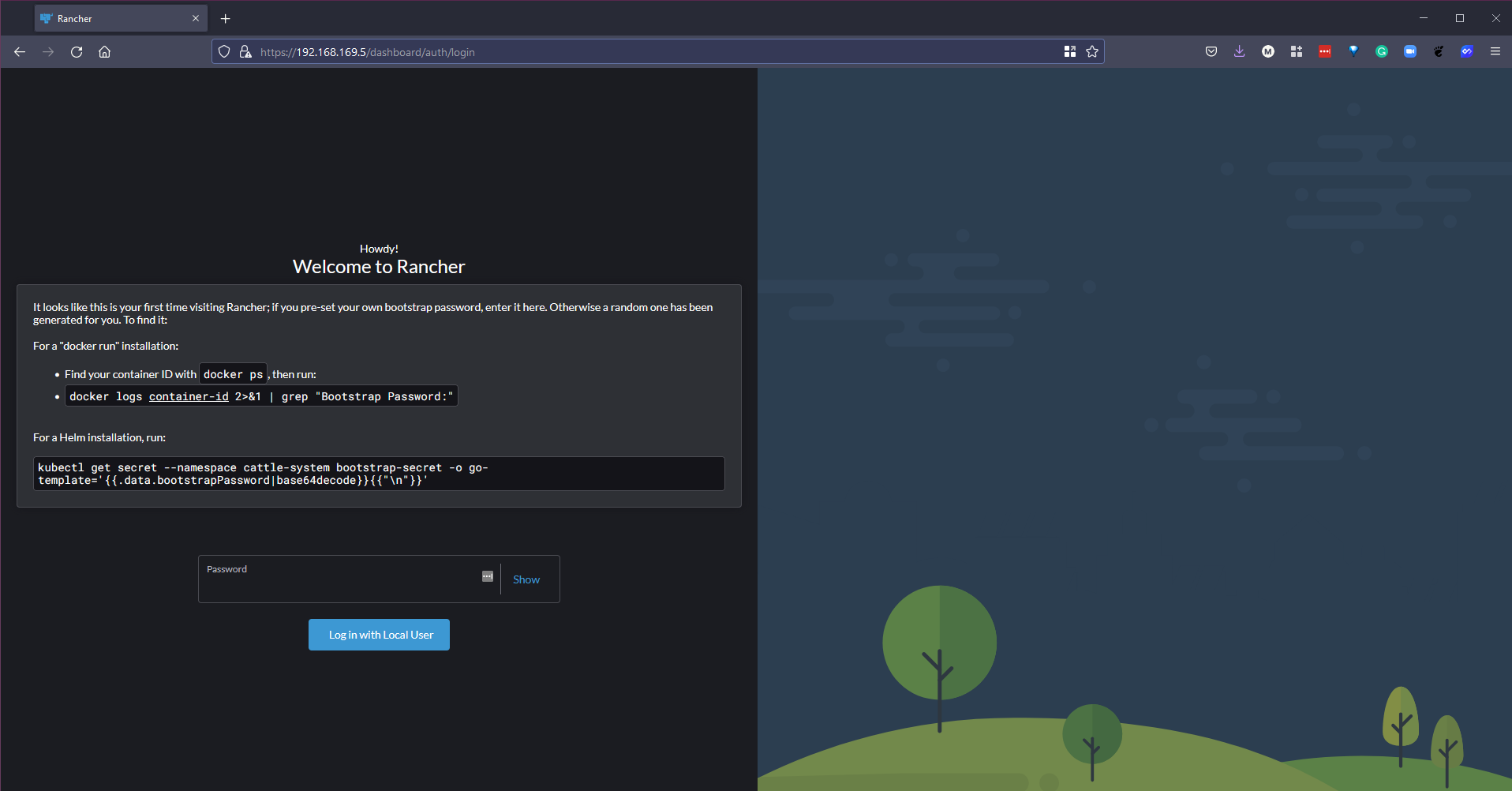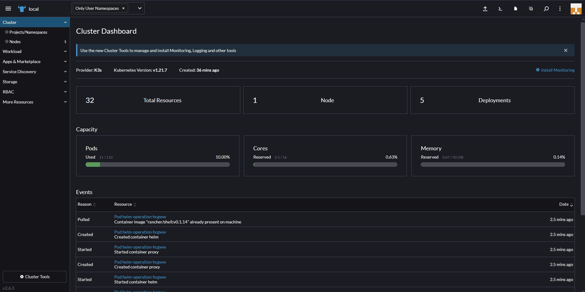 Khi chúng ta đã làm những điều trên, chúng ta sẽ đăng nhập và có thể thấy màn hình sau. Là một phần của triển khai Rancher, chúng ta cũng thấy một K3s cluster được tạo.