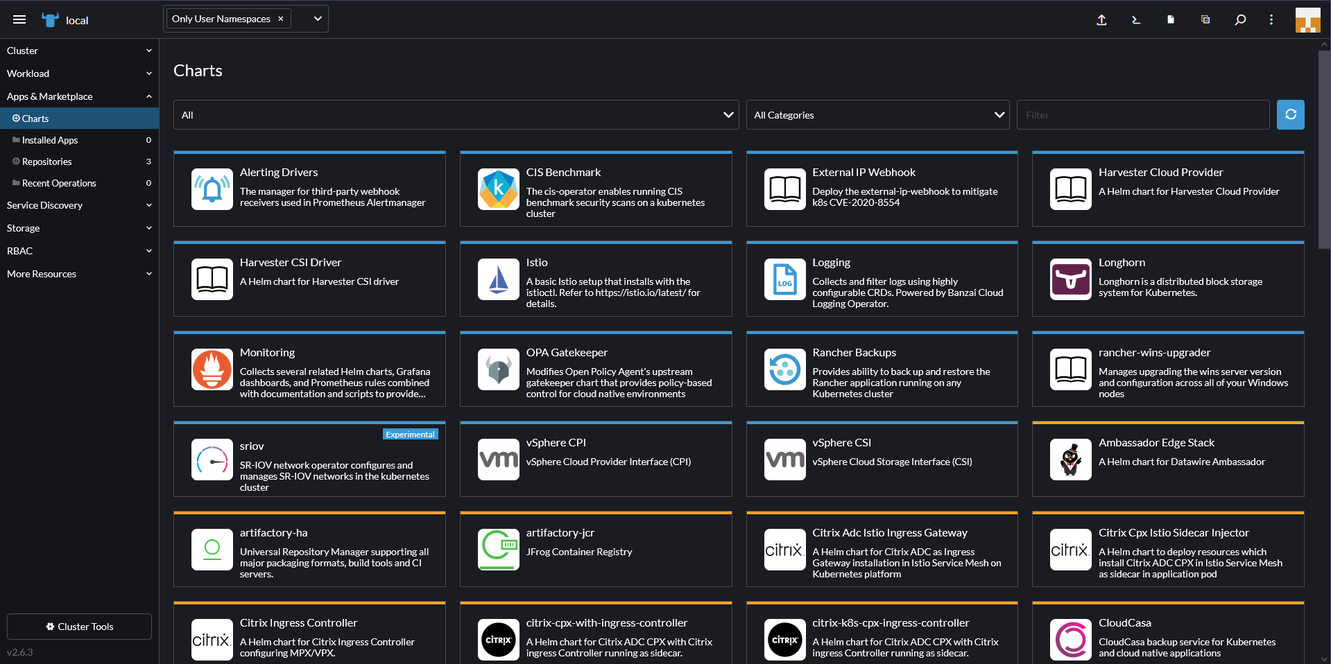 Trên menu bên trái, chúng ta cũng có tab "Apps & Marketplace", điều này cho phép chúng ta chọn các ứng dụng mà chúng ta muốn chạy trên các cluster của mình, như đã đề cập, Rancher cung cấp cho chúng ta khả năng chạy hoặc quản lý các clusters khác nhau. Với marketplace, chúng ta có thể triển khai các ứng dụng của mình rất dễ dàng.