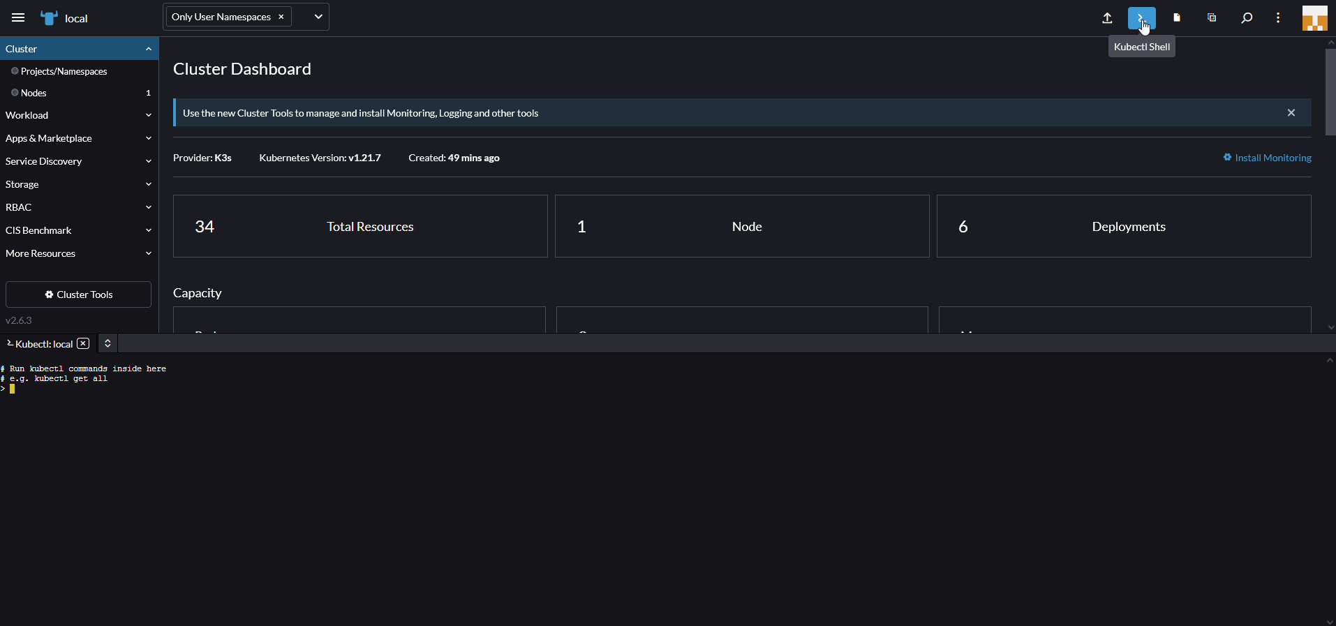 Một điều khác cần đề cập tới là nếu bạn cần có quyền truy cập vào bất cứ cluster nào do Rancher quản lý, ở trên cùng bên phải, bạo có thể mở một kubectl shell tới cluster mà bạn chọn.