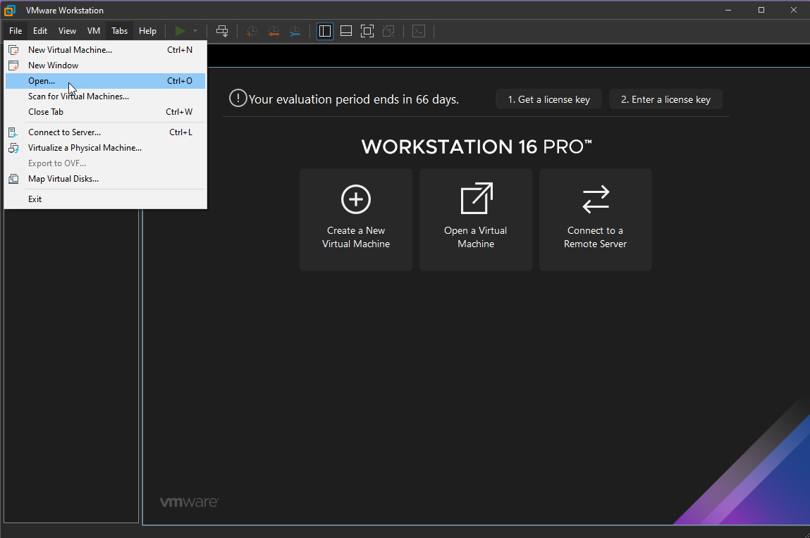 Mở VMware Workstation rồi chọn file và open