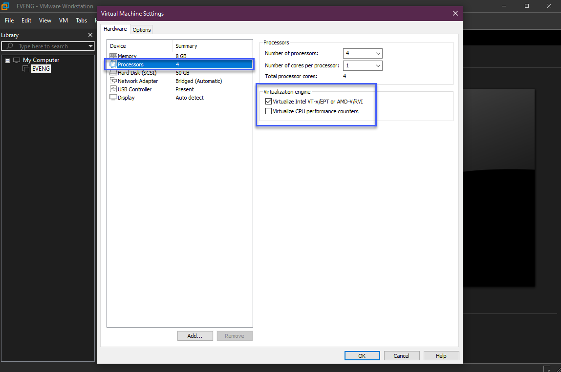 Ngoài ra, hãy đảm bảo tùy chọn Virtualise Intel VT-x/EPT hoặc AMD-V/RVI đã được bật. Tùy chọn này hướng dẫn VMware chuyển các cờ ảo hóa cho HĐH khách (ảo hóa lồng nhau) Đây là vấn đề tôi gặp phải khi sử dụng GNS3 với Virtual Box mặc dù CPU của tôi hỗ trợ tính năng này.