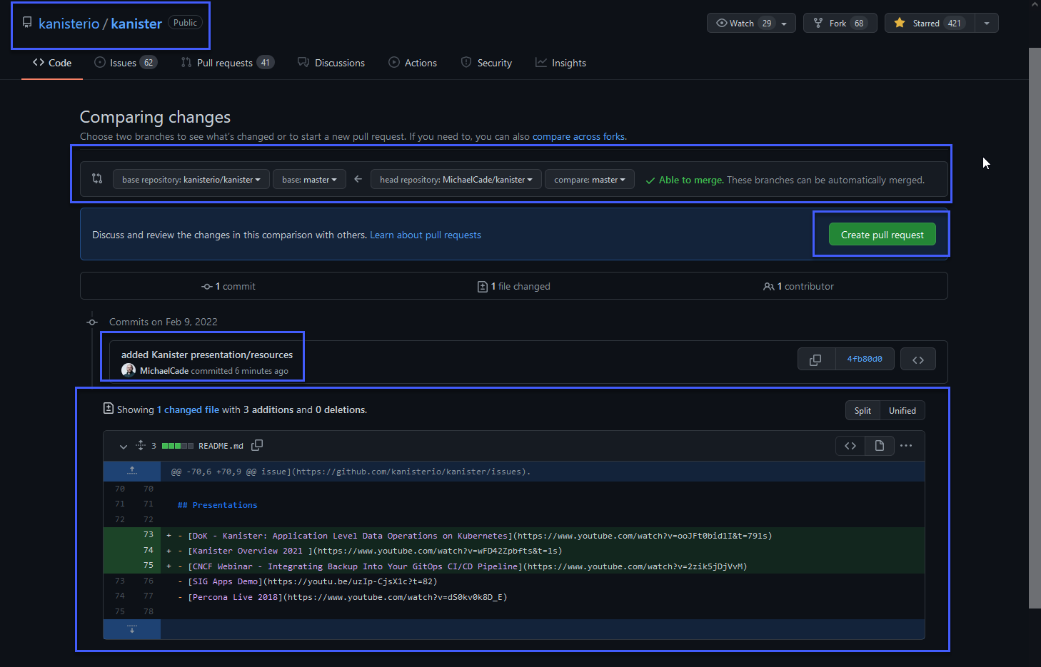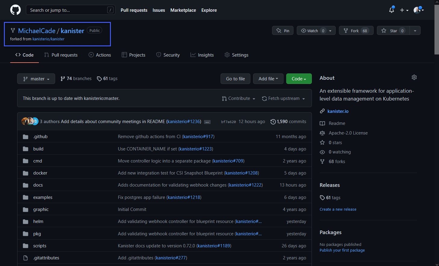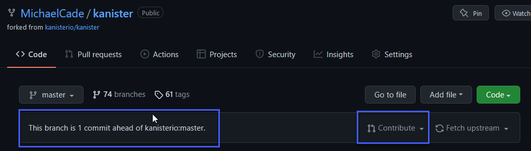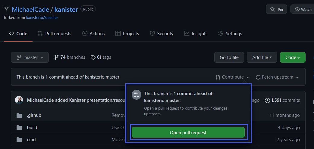 Bây giờ chúng ta có thể quay trở lại kho lưu trữ được forked của Kanister và thấy rằng mình đang ở trước một commit so với nhánh kanisterio:master.