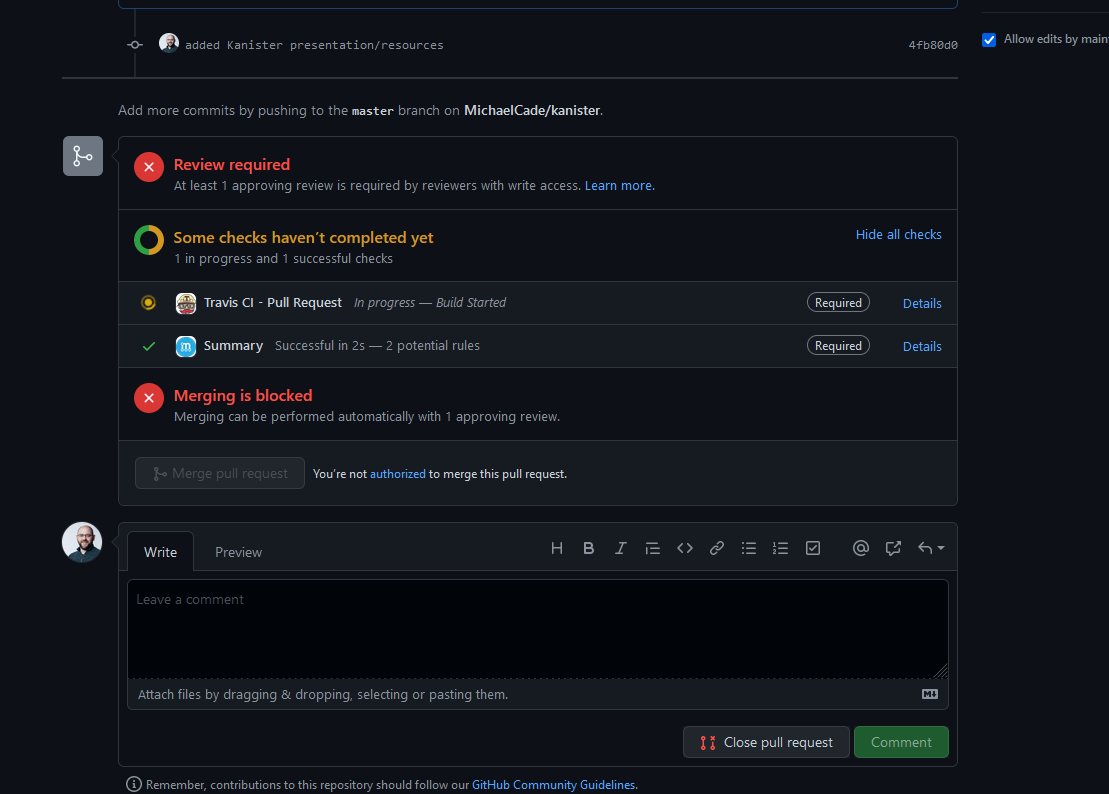 Kéo xuống dưới, bạn có thể thấy một số quá trình tự động hoá đang diễn ra, trong trường hợp này, chúng ta yêu cầu một review cho pull request của mình. Chúng ta có thể thấy Travis CI đang được tiến hành và quá trình build đã được bắt đầu và nó sẽ kiểm tra bản cập nhật của chúng ta, đảm bảo bổ sung mới không phá vỡ bất cứ điều gì.