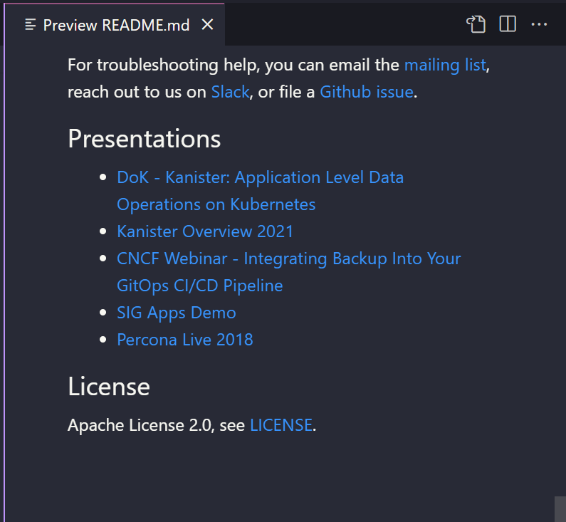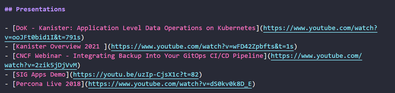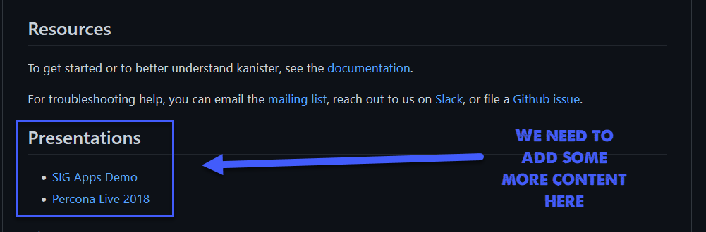 Điều đầu tiên chúng ta phải làm là tìm một dự án mà chúng ta có thể đóng góp. Gần đây, tôi đã thuyết trình về dự án Kanister Project và tôi muốn chia sẻ các bài thuyết trình của mình đã được đăng tải trên Youtube tới tệp Readme.md trong project đó.